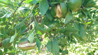 栽培日記 甘平の裂果 愛媛の高級柑橘の1つ”甘平(かんペい)”ただ甘平の栽培は、特に玉が大きくなるこの時期、実の肥大に外皮がついていけず、せっかく育った果実がパックンパックンと縦割れ、横割れと今年も多くの裂果が発生しはじめました 2025.09.06 栽培日記